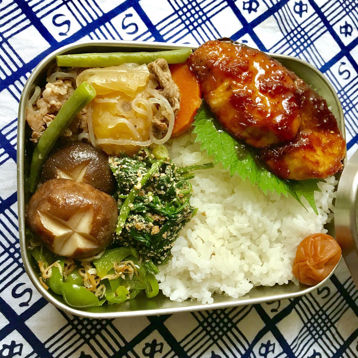 キューライス No Twitter 今日のお弁当 ブリの照り焼き 肉じゃが 椎茸のめんつゆ煮 ほうれん草の胡麻和え じゃこピーマン 隠し海苔弁 しばらく洋食弁当だったから 今日は和食弁当にした